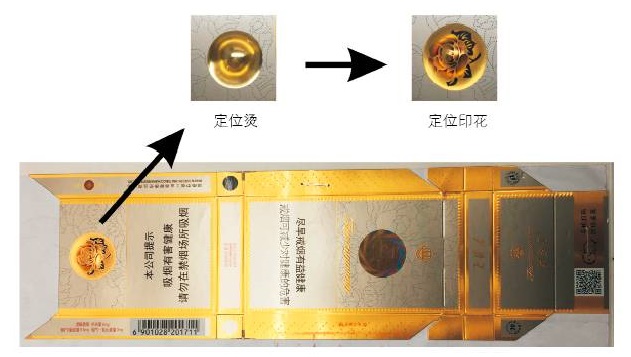 其次,該煙包運用了先定位燙再膠印的加工工藝,根據工藝設計特點(diǎn),定位燙的精度偏差應控制在0.30mm以?xún)?,其?shí)這個(gè)精度要求對于定位燙來(lái)說(shuō)已經(jīng)很低了,之所以能允許這么大的寬容度,全有賴(lài)于后續定位印花工藝對定位燙偏差量的壓邊修飾與遮蓋。但由于定位印花直接印在定位燙圖案上,因此在定位燙實(shí)施過(guò)程中,需要重點(diǎn)控制電化鋁的附著(zhù)力,同時(shí)也要關(guān)注燙印壓力的控制,這直接關(guān)系到定位燙的鎖邊邊緣是否燙印良好。所以,對于定位燙工藝而言,控制重點(diǎn)并非燙印規線(xiàn),而是電化鋁的附著(zhù)力和燙印壓力。