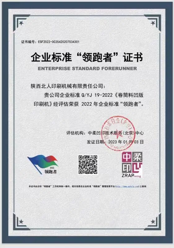 喜訊傳來(lái)!近日,2022年度全國企業(yè)標準“領(lǐng)跑者”在國家企業(yè)標準領(lǐng)跑者管理信息平臺上正式發(fā)布,陜西北人印刷機械有限責任公司企業(yè)標準《卷筒料凹版印刷機》榮獲2022年國家級企業(yè)標準“領(lǐng)跑者”證書(shū)。