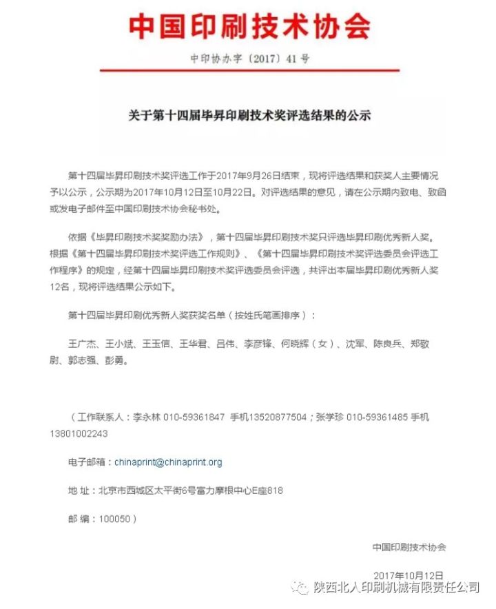 經(jīng)第十四屆畢昇印刷技術(shù)獎評選委員會(huì )評選,并經(jīng)中國印刷行業(yè)網(wǎng)公示,陜西北人印刷機械有限責任公司總經(jīng)理李彥鋒被評為“畢昇印刷優(yōu)秀新人獎”