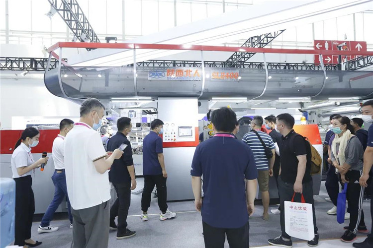 參展觀(guān)眾觀(guān)看北人智能子公司陜西北人SLⅡ400雙工位無(wú)溶劑復合機產(chǎn)品演示