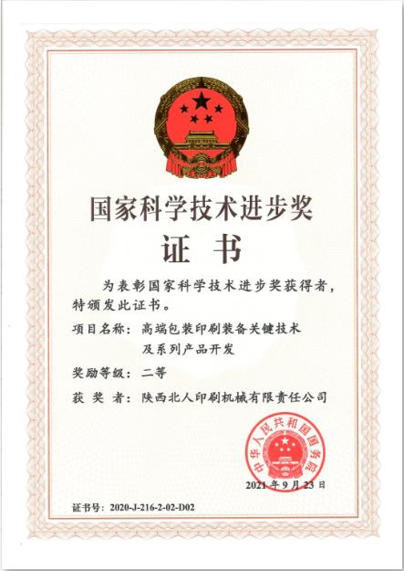 北人智能公司黨委副書(shū)記、總經(jīng)理李彥鋒,總工程師薛志成作為主要完成人參與完成的“高端包裝印刷裝備關(guān)鍵技術(shù)及系列產(chǎn)品開(kāi)發(fā)”項目,獲國家科學(xué)技術(shù)進(jìn)步獎二等獎!